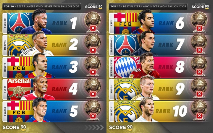 09月25日讯 外媒Score 90排无金球球员TOP10,内马尔居首,姆巴佩第二,英超直播伊涅斯塔第三。