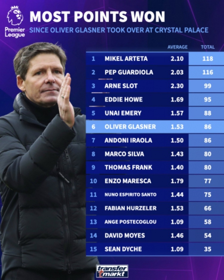 自从格拉斯纳执教水晶宫以来,球队在英超一共获得了86分,排在英超第六位,格拉斯纳的场均积分 为1.53分。而且很可能在本赛季跨越 埃梅里,升至第五位。格拉斯纳在水晶宫的英超场均积分 比前任霍奇森高出25%,他已经是英超时期水晶宫俱乐部场均积分 最高的主帅。