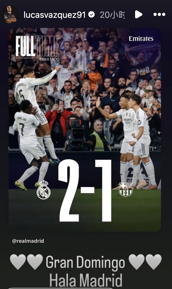 已经离开皇马的巴斯克斯更新社交媒体,庆祝老东家在国家德比中击败巴萨获得获胜 。