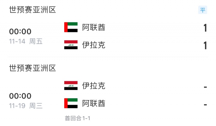 11月14日讯 世预赛亚洲区第五阶段首局 ,伊拉克与阿联酋1-1战平,双方在的第二局 较量前继续保持微妙均衡 。