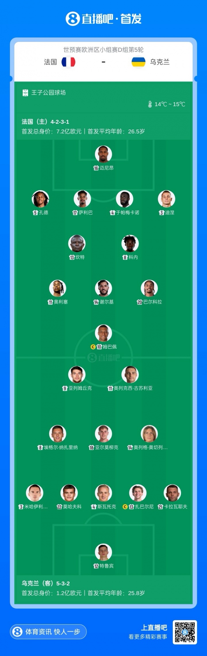 11月14日讯 世预赛欧洲区小组赛D组第5轮,法国主场作战 迎战乌克兰,赛前双方杆位公布。