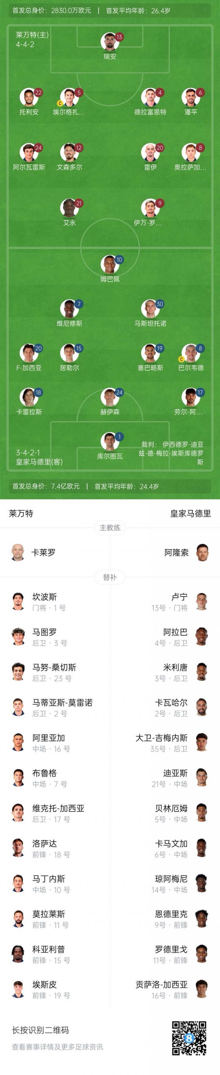 皇马杆位:1-库尔图瓦、17-阿森西奥、24-赫伊森、18-卡雷拉斯、20-弗兰-加西亚、8-巴尔韦德、19-塞巴略斯、15-居勒尔、30-马斯坦托诺、7-维尼修斯、10-姆巴佩