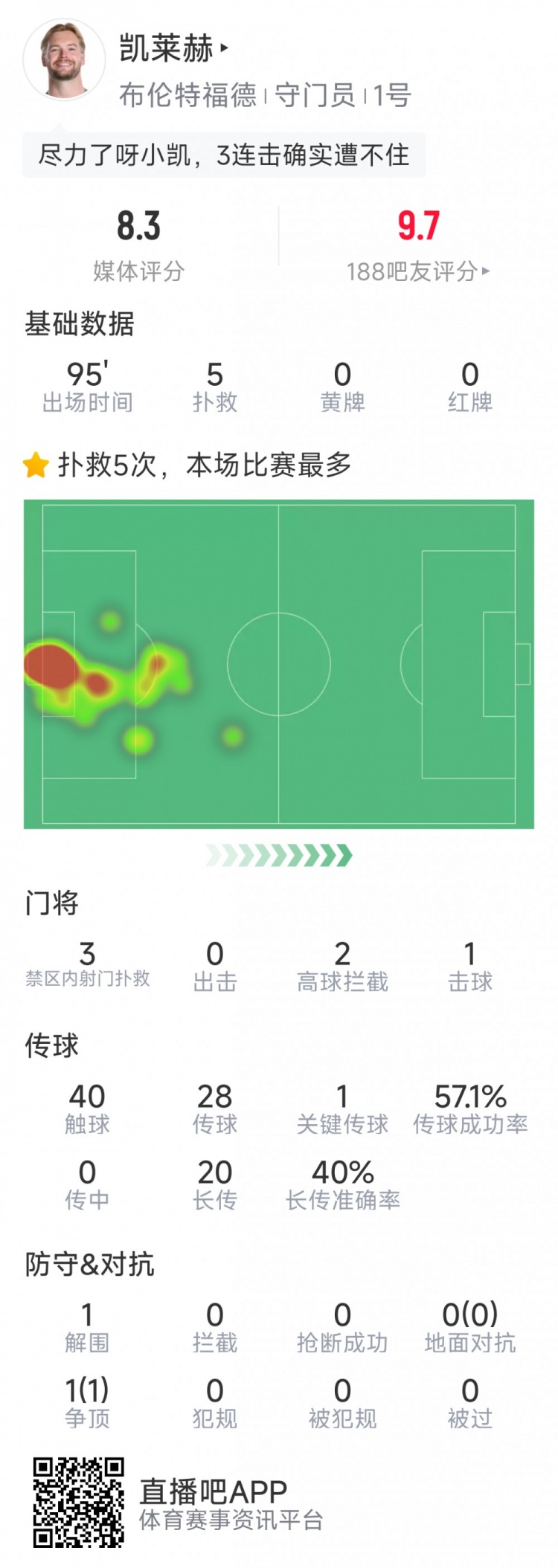 本场赛事 凯莱赫发挥出色,完成5次成功抢救 ,并且扑出对手十二码球,英超免费高清直播40次触球,传送球 成功率57%,1次解围,1次成功对峙 。