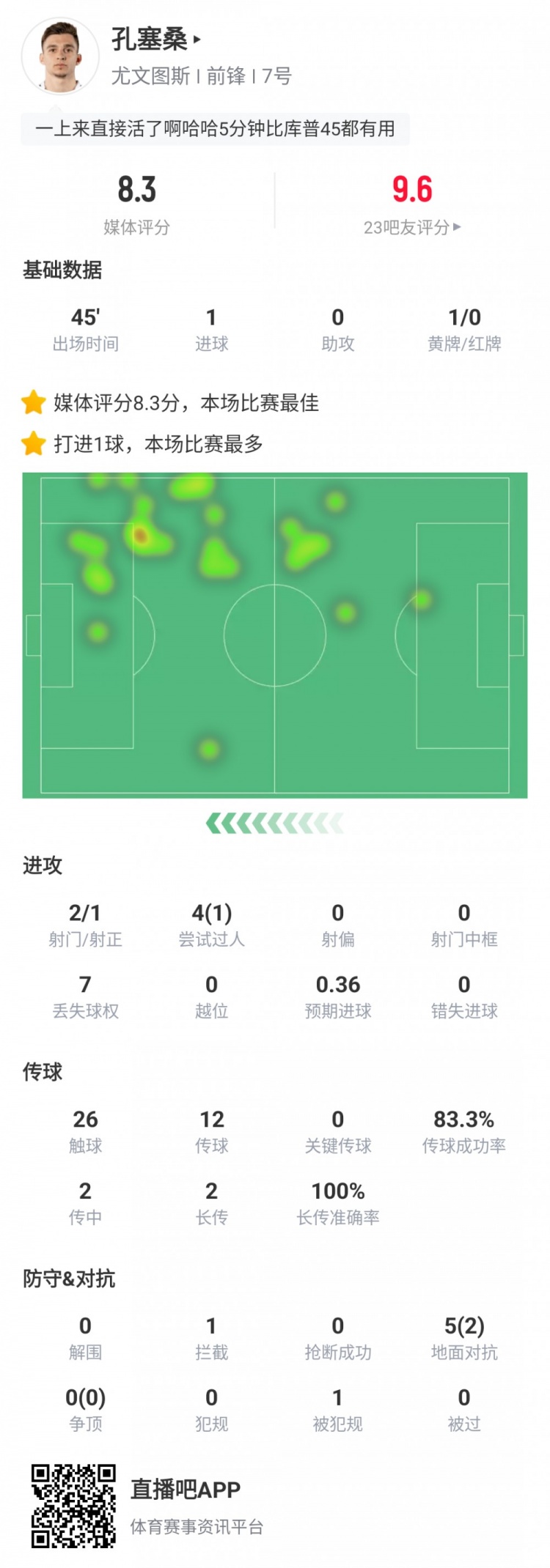 10月2日讯 尤文在本轮欧冠客场应战 2-2战平比利亚雷亚尔,后备 出场的小孔塞桑表现出色,英超免费高清直播以下是他的个人数据: