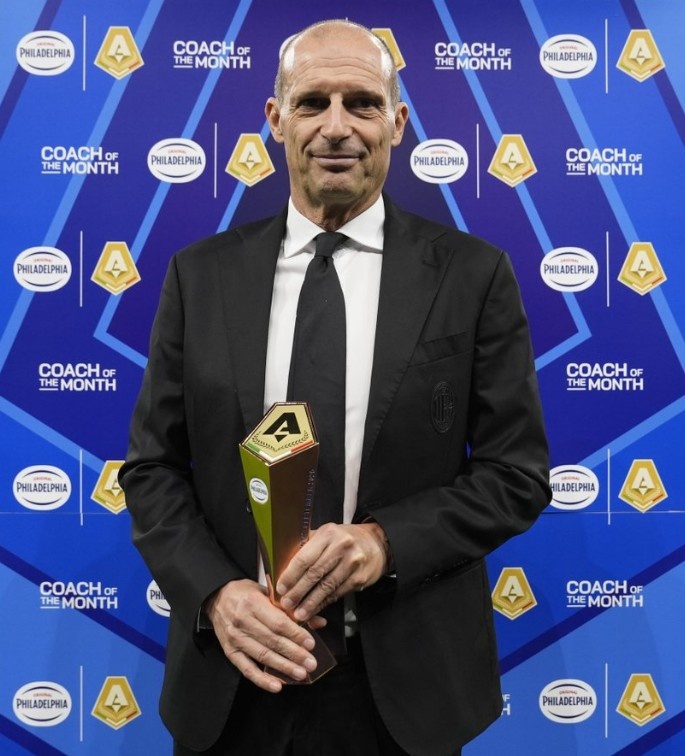 10月25日讯 意甲官方晒照,米兰主帅阿莱格里在米兰对阵比萨赛前领取了九月最佳指导教练员奖杯。