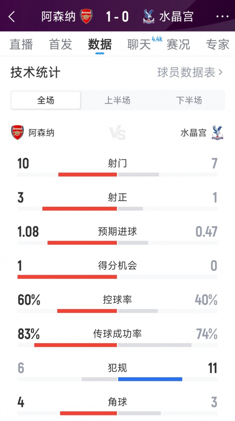 10月26日讯 本轮英超,英超直播在线高清(无插件)阿森纳1-0击败水晶宫。以下为双方全场数据对比: