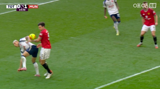 11月08日讯 英超第11轮,热刺vs曼联,赛事 第65分钟,英超免费高清直播马奎尔在危险区域 内手臂触球,但裁判 没有表示,VAR也没有介入。