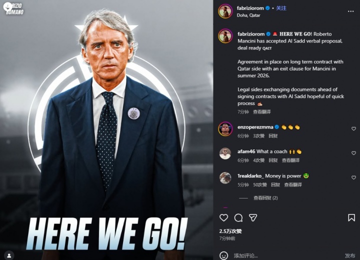 罗马诺在社媒写到:罗伯托・曼奇尼已接受阿尔萨德俱乐部的口头提议,交易基本敲定。
