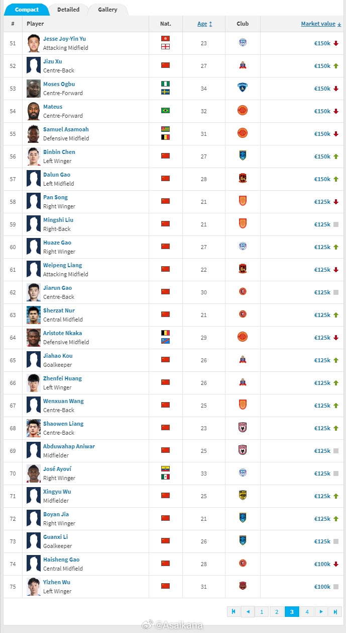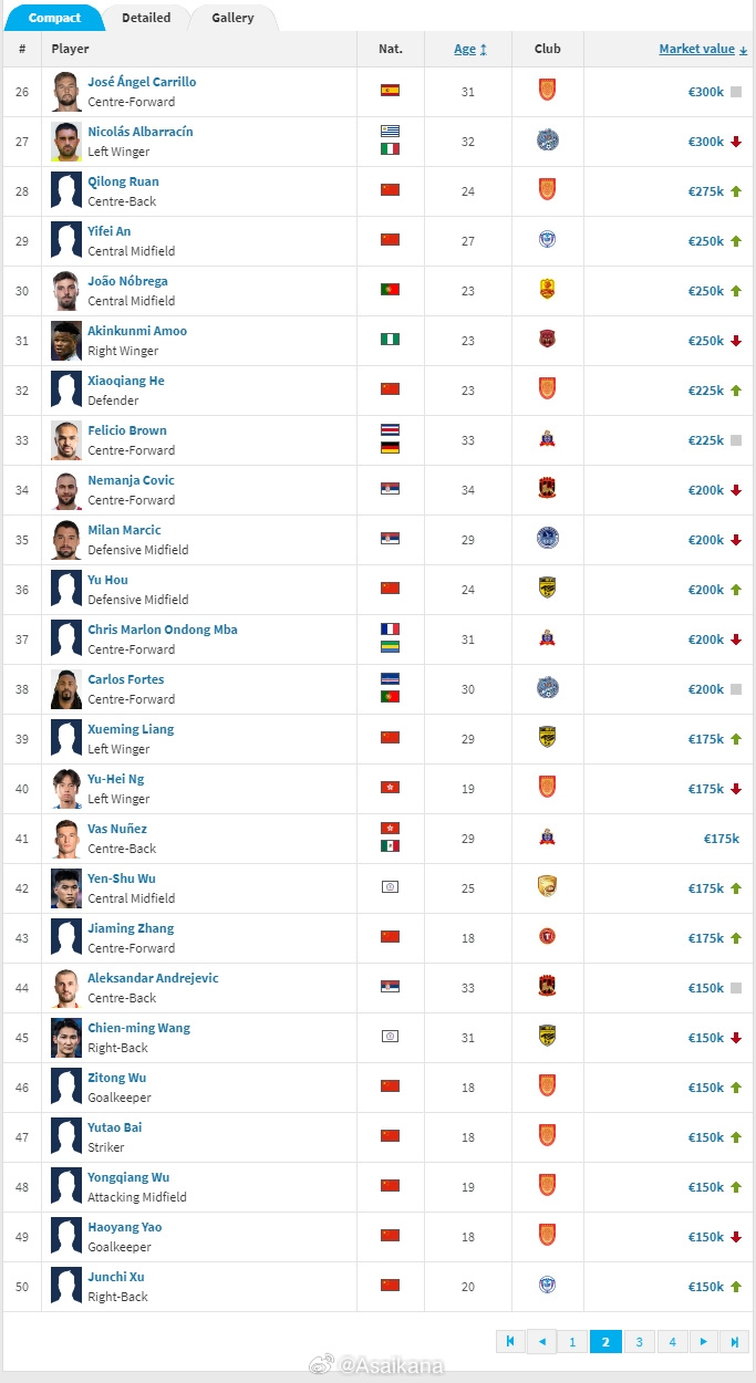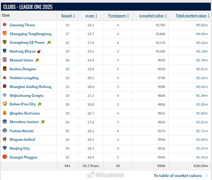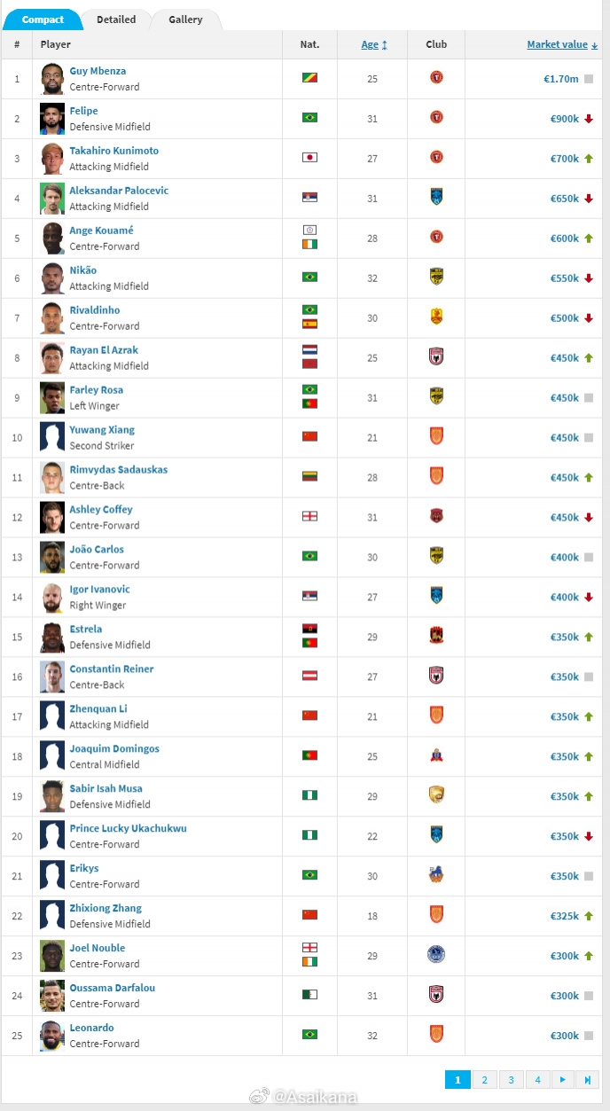 德国转会市场网(TransferMarkt.de)2025年中中甲球员身价例行更新今日已上线。