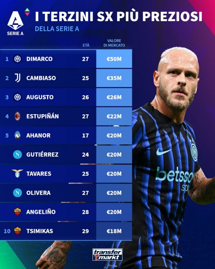 10月13日讯 德国转会市场盘点了意甲职业联赛 左后场球员身价,迪马尔科5000万欧元居首。