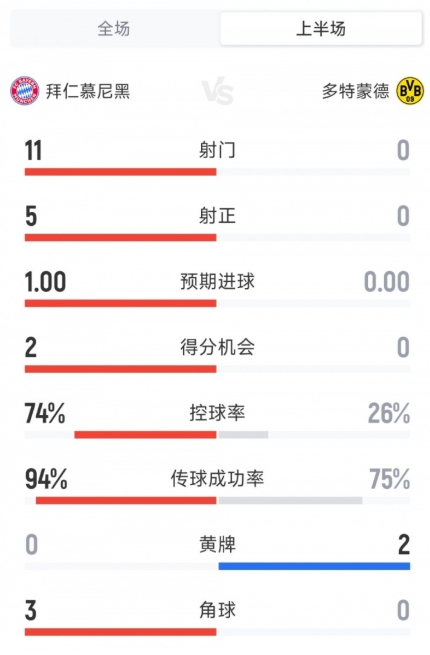 预期得分 数拜仁0.78领跑 多特,盘带时间 拜仁74%领跑 多特26%。