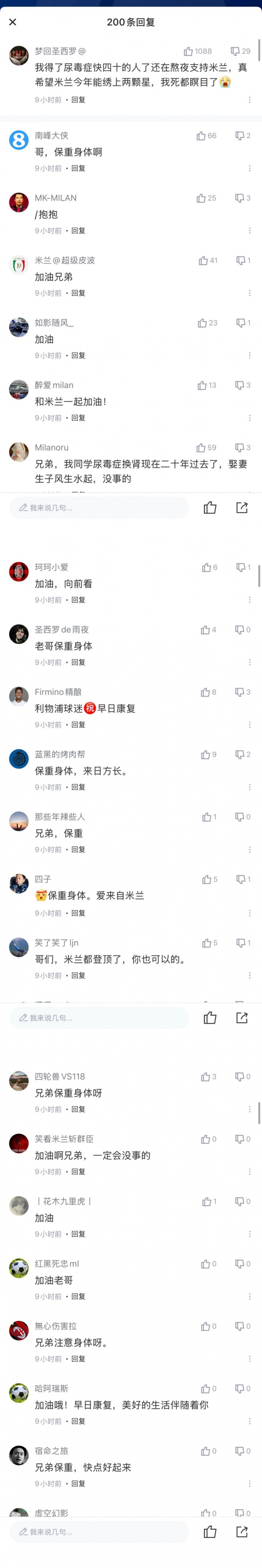 吧友【梦回圣西罗@】在AC米兰战报评论区评论:我得了尿毒症快四十的人了还在熬夜支持米兰,真希望米兰今年能绣上两颗星,我死都瞑目了。