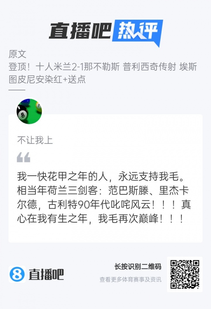 意甲第5轮,十人AC米兰2-1那不勒斯,登顶意甲!对于红黑军团的出色表现,不少老球迷都在评论区发出感叹!其中一位名为【梦回圣西罗@】的吧友的评论,让人动容。