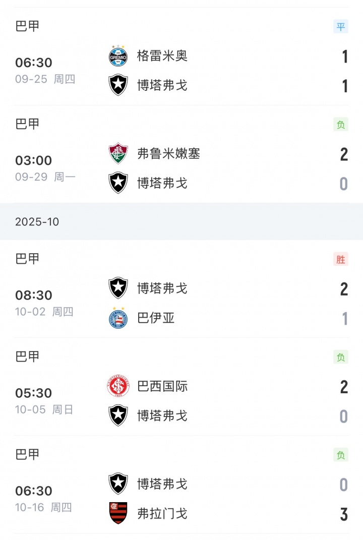 博塔弗戈近期战绩↓