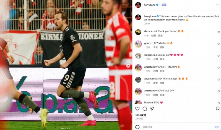 凯恩也在赛后通过社媒晒出自己得分 后的庆祝照,并配文:“这支球队永不放弃!没拿到我们想要的获胜 ,但从客场应战 带走重要一分💪”。