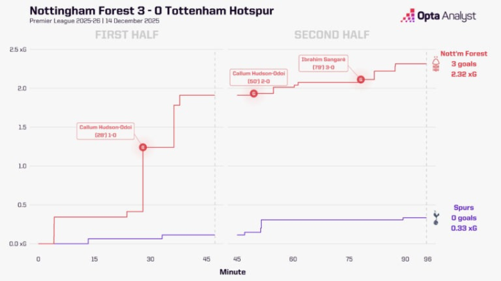 这场赛事 ,热刺的预期得分 值只有 0.33,是森林本赛季面对的最低水平之一;更刺眼的是,这居然只是热刺本赛季英超第四低的单场 xG。