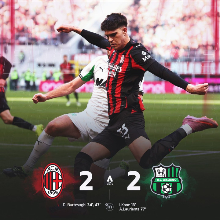 俱乐部126周年庆典前的献礼之战再度被萨索洛逼平,米兰以1分之差让出榜首的同时,也收获了巴尔特萨吉连进两球的记录 。