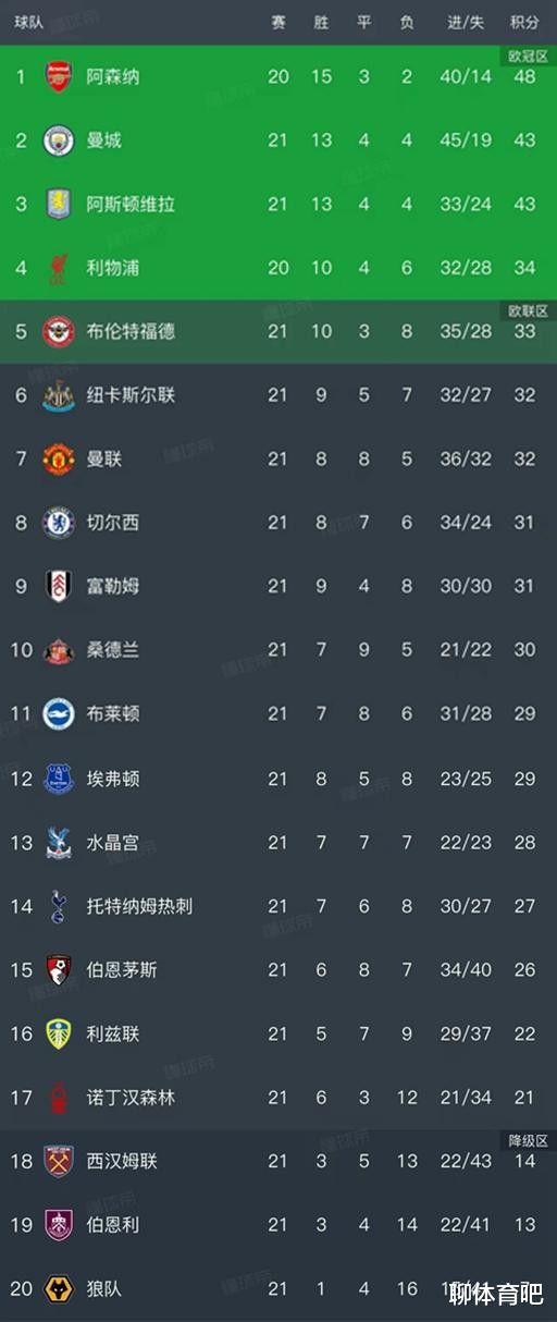 英超最新积分榜